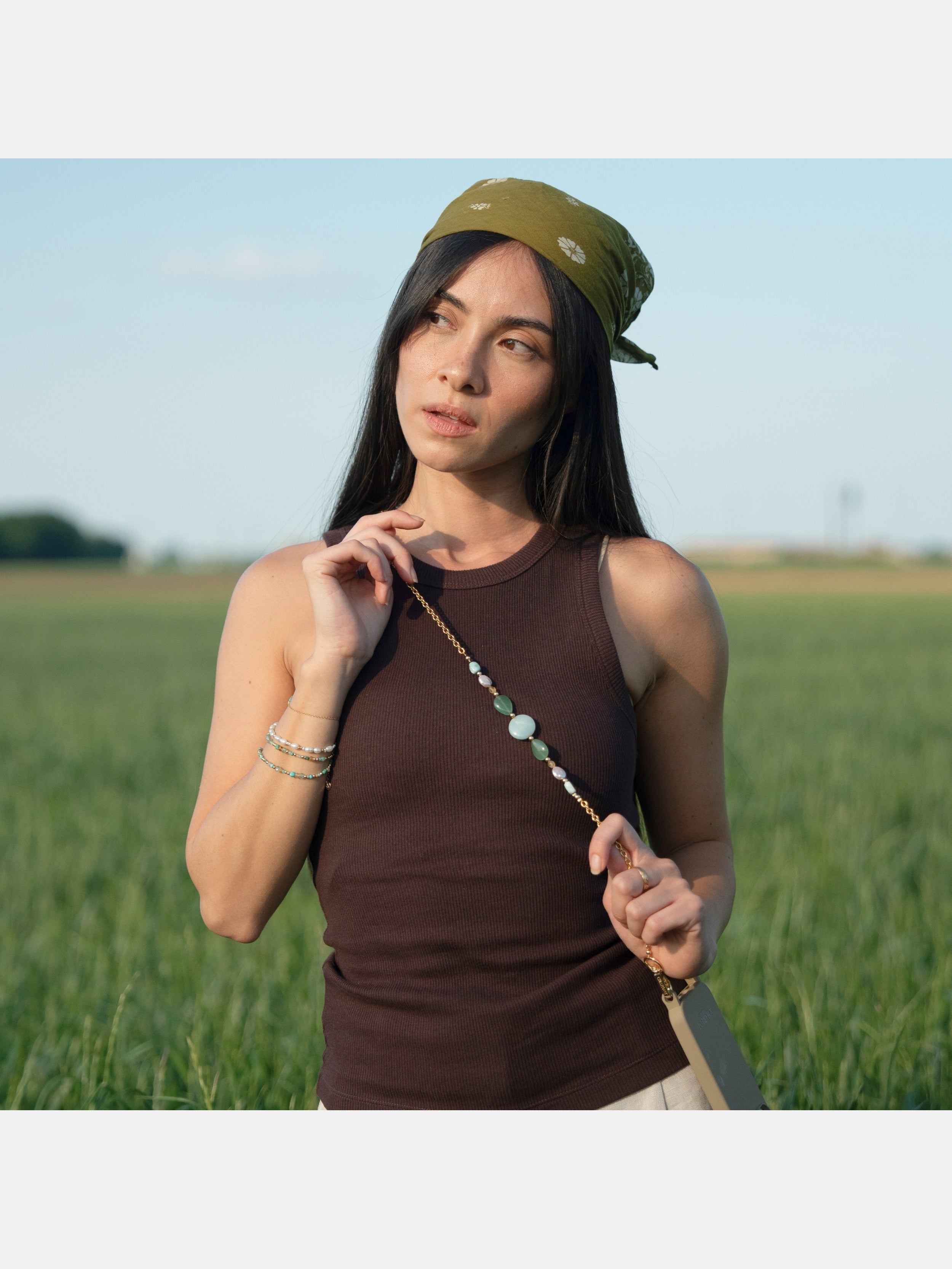 Le sue pietre naturali donano un tocco prezioso e colorato alla tua vita quotidiana. Perfetto per liberare le mani con stile, in modalità mani libere, abbronzato e ben accessoriato.